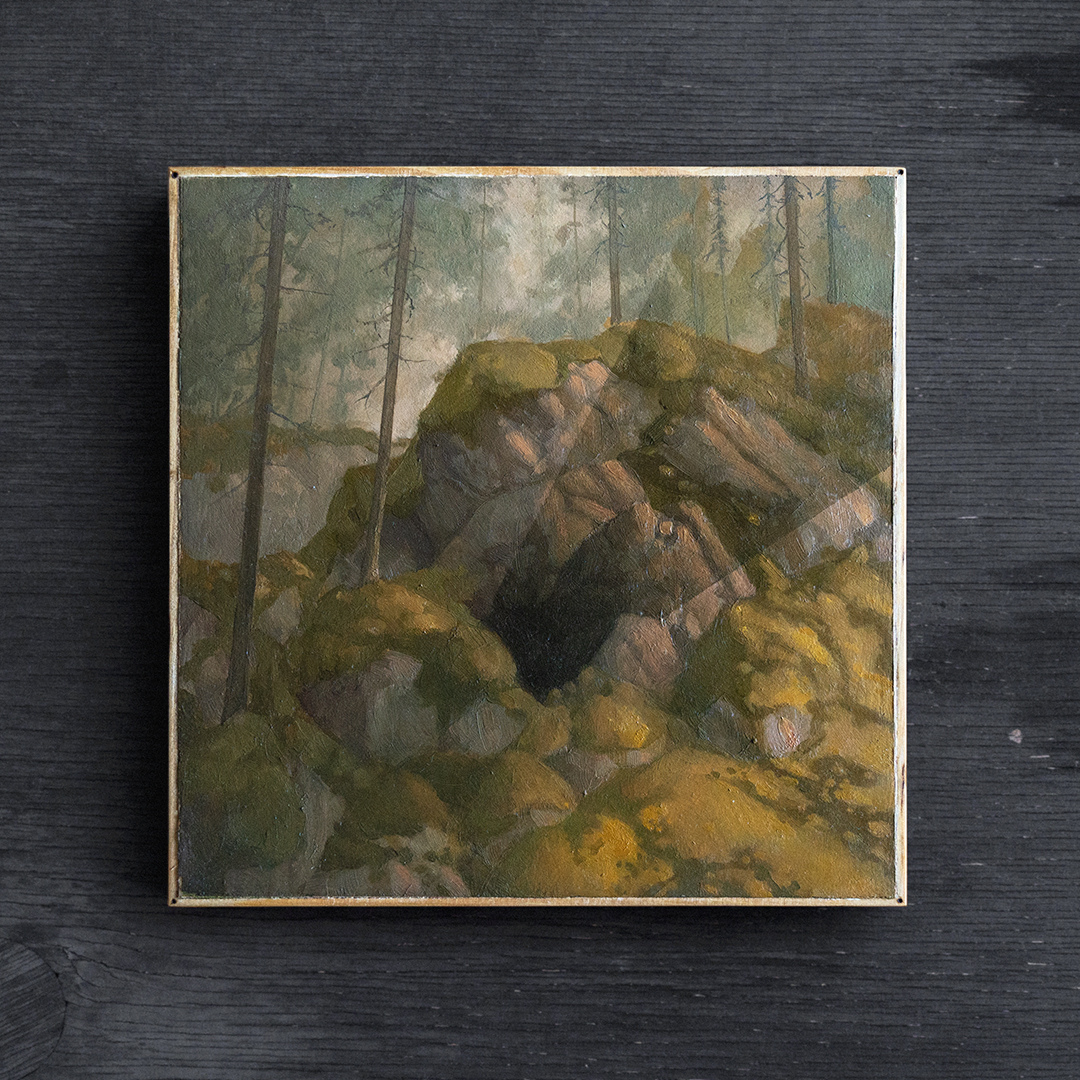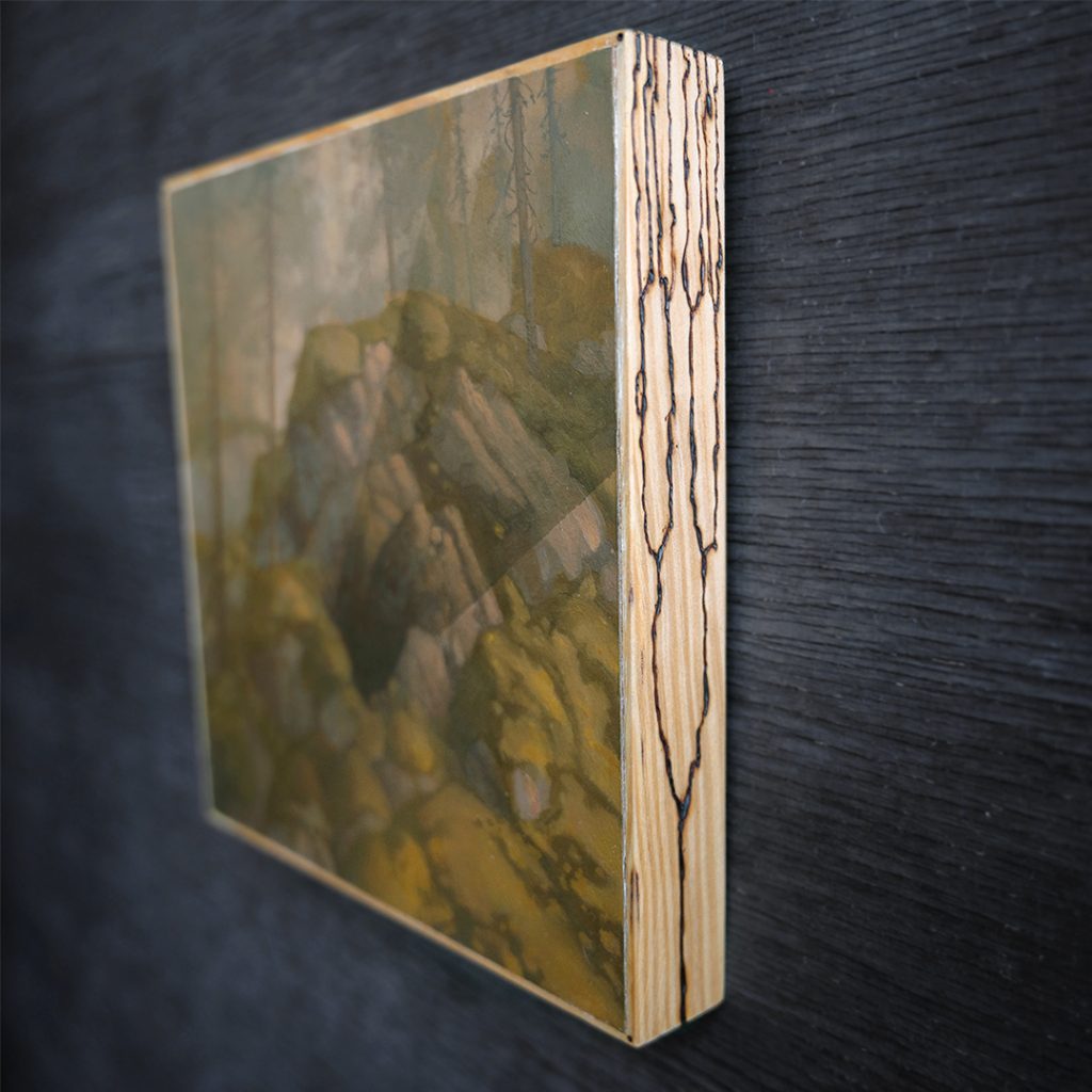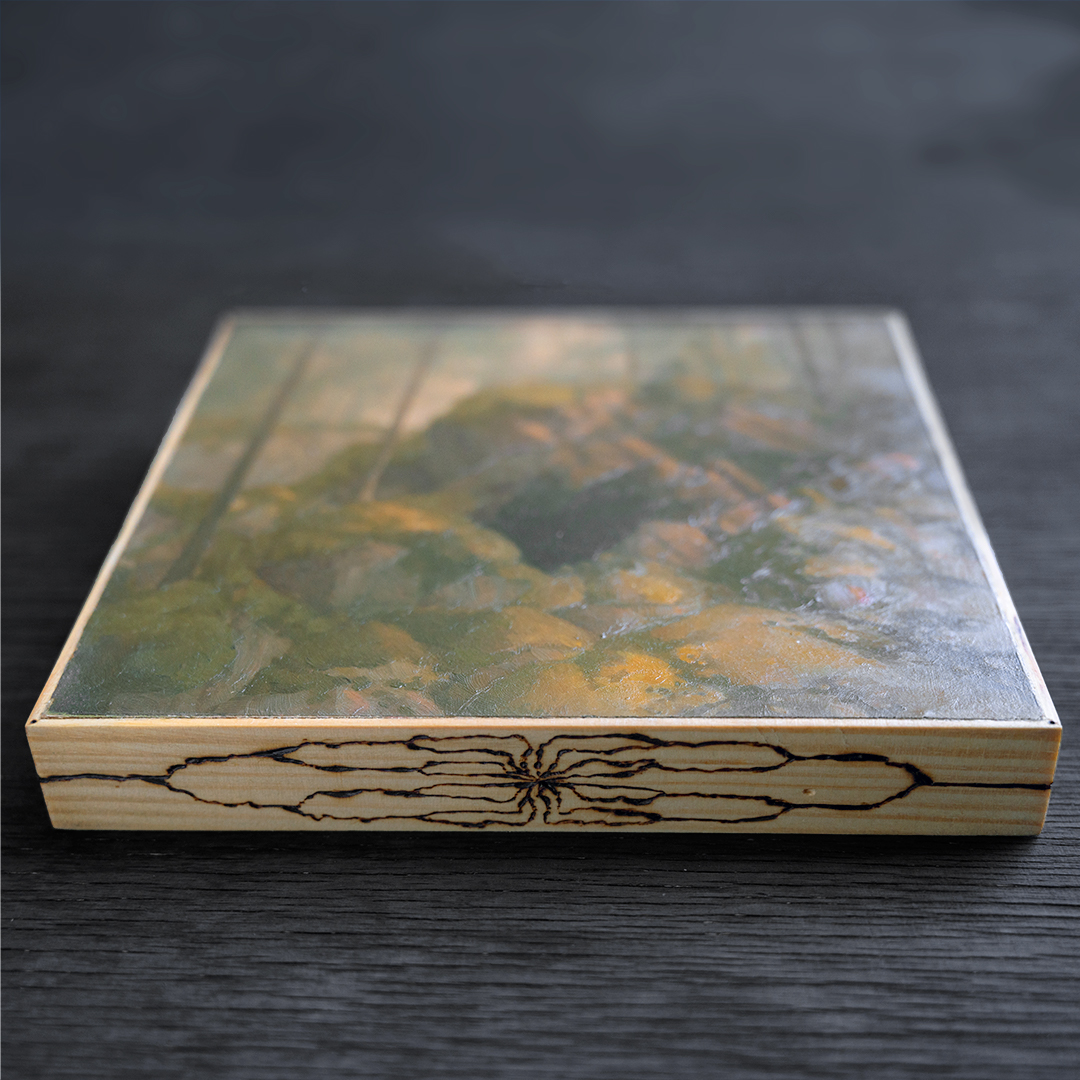 Horrosuni 2026 Oil on mdf panel, pyrography on wood frames 17 x 17 cm Original: AvailableLicence: Available